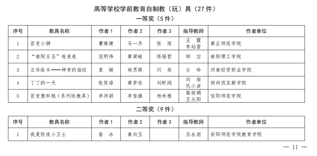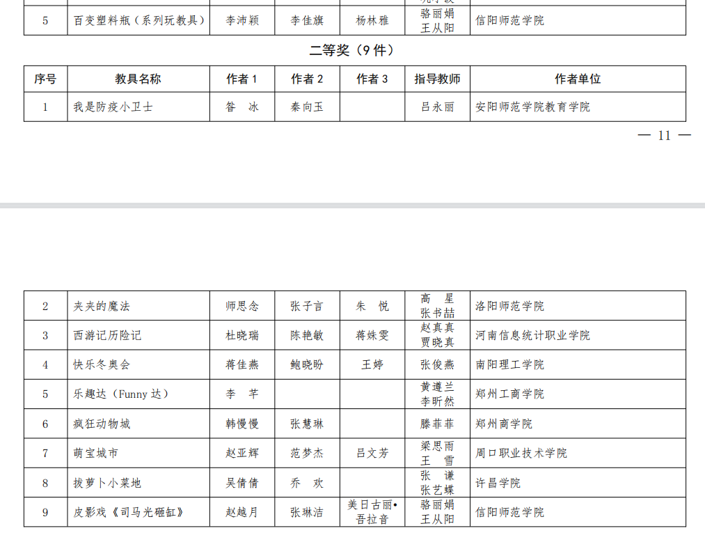 时间:2022-09-28 17:39:24 来源: 作者: 阅读: 次近日,河南省教育厅公布了第十九届河南省中小学幼儿园自制教(玩)具暨学生科技创新小制作小发明评选活动获奖名单,我院首次参赛的2件作品均获佳绩。其中,2020级学前教育本科2班李沛颖、李佳旗、杨林雅的作品《百变塑料瓶(系列玩教具)》(指导教师:骆丽娟、王从阳)获高等学校学前教育自制教(玩)具组一等奖,2020级学前教育本科1班赵越月、张琳洁、美日古丽?吾拉音的作品《皮影戏<司马光砸缸>》(指导教师:骆丽娟、王从阳)获二等奖。