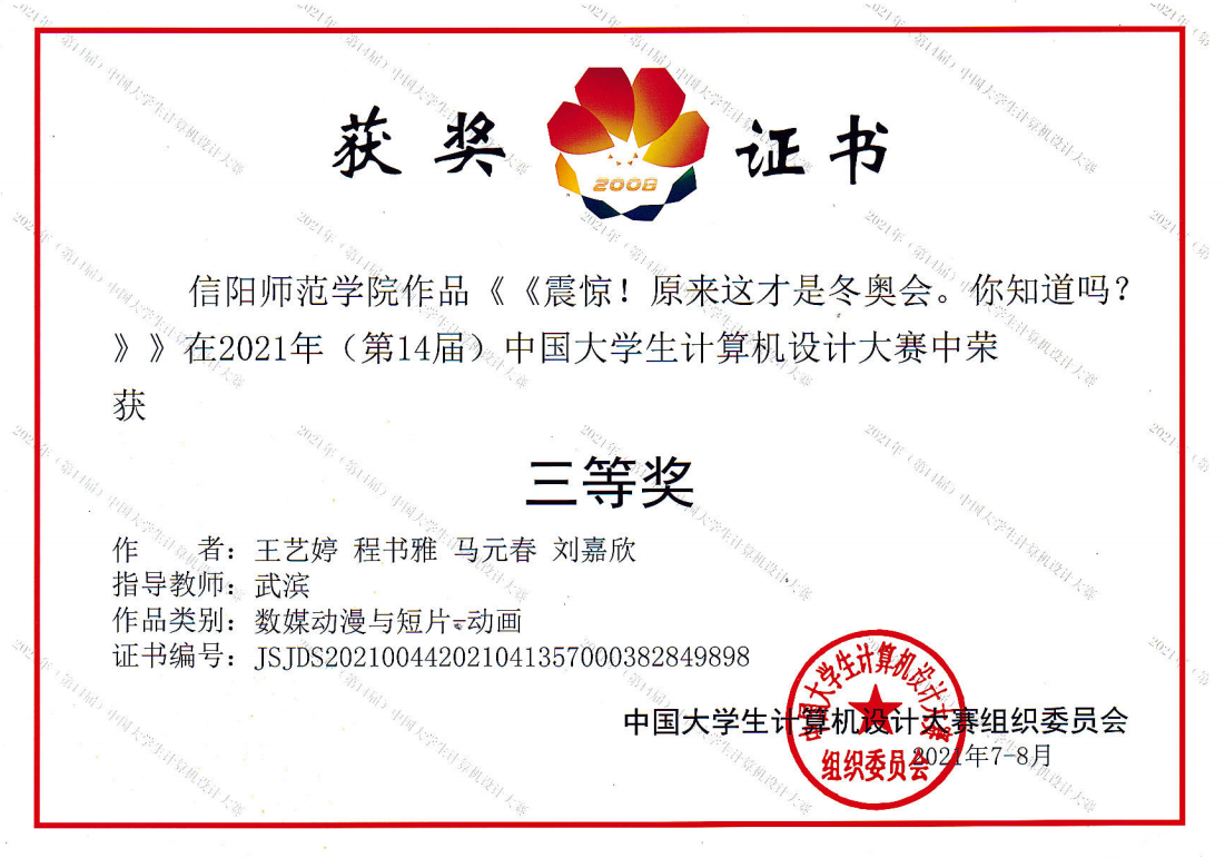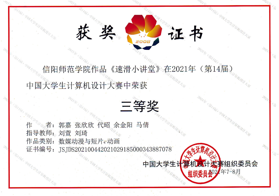 近日,由国家教育部主办的2021年第十四届中国大学生计算机设计大赛落下帷幕,在厦门决赛赛区数媒动漫与短片普通组比赛中,我院两组作品经过河南省大赛推选,与全国上百所高校参赛作品进行角逐,最终脱颖而出,均荣获国家级三等奖。获奖作品是由我院教育技术系老师武滨指导,王艺婷、马元春、刘嘉欣和程书雅完成的动画作品《震惊!原来这才是冬奥会。你知道吗?》,刘萱、刘琦老师指导,郭嘉、张欣欣、代昭、余金阳和马倩完成的动画作品《速滑小讲堂》。