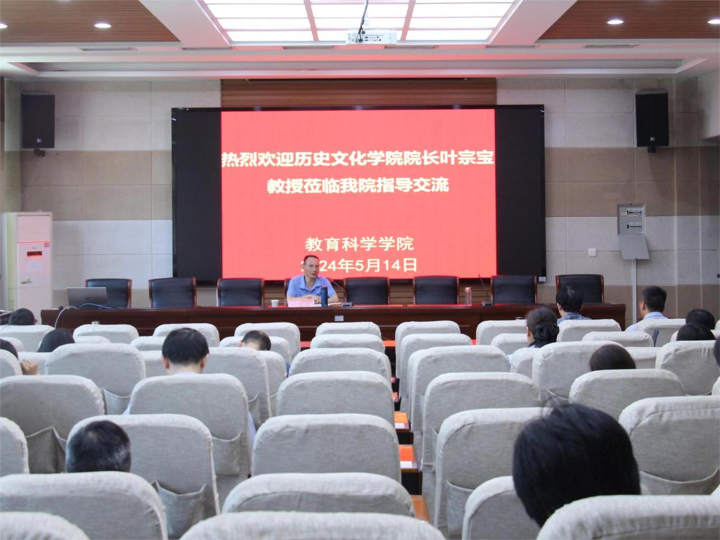 5月14日,历史文化学院院长叶宗宝教授到我院作交流指导,会议在教科楼301会议室开展。教育科学学院院长何安明、副院长郭勇、孙天义以及全体教职工参加会议。会议由何安明主持。