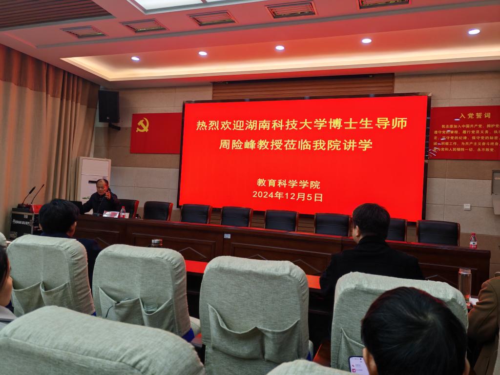 12月5日上午,应教育科学学院邀请,湖南科技大学周险峰教授于教科楼301报告厅做了题为“教研主题的确立与表达”的指导报告会。会议由教育科学学院院长何安明主持,全体教师及部分研究生参加了此次会议。