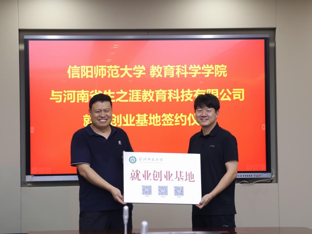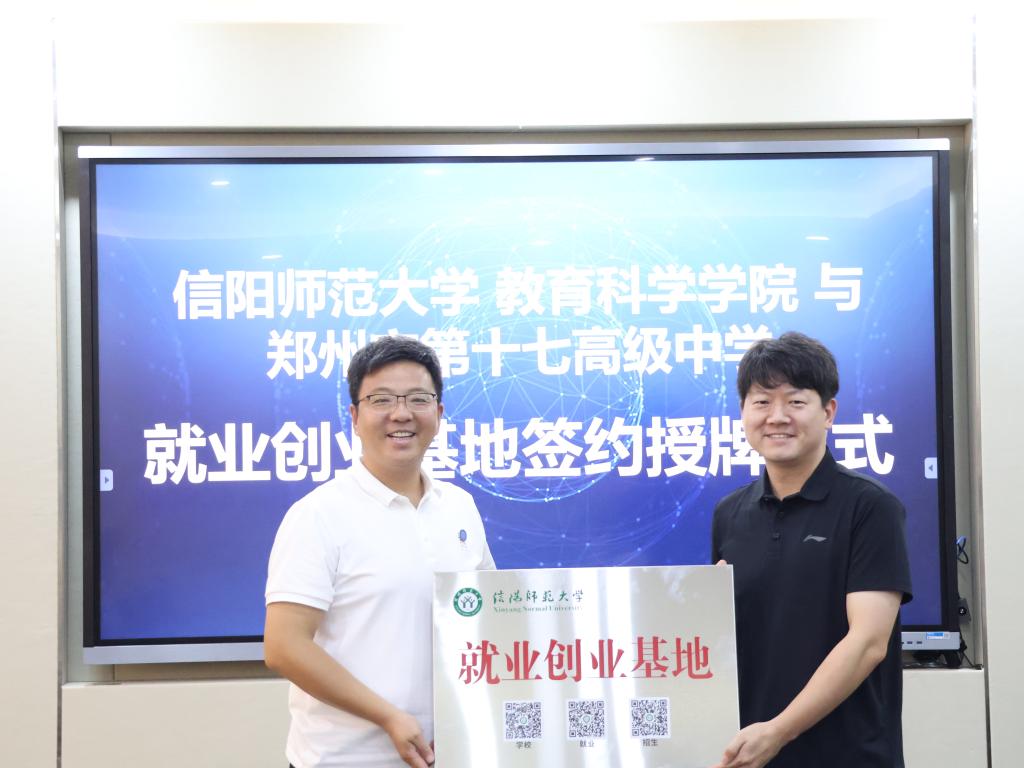 缑星代表学院分别与各用人单位签署校企合作协议,并向郑州市第十七高级中学、河南省生之涯教育科技有限公司、澳德菲尔工程科技(河南)有限公司授予“信阳师范大学就业创业基地”牌匾。