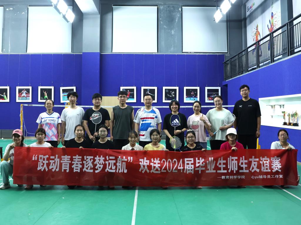 时间:2024-05-31 19:43:56 来源:教科院新闻宣传中心 作者:吴宇熙 祐亚菊 阅读: 次毕业在即,为了增强毕业生对母校的归属感和认同感,营造轻松愉悦的毕业氛围,5月30日,教育科学学院在体育馆举办2024年度欢送毕业生羽毛球师生友谊赛。教育科学学院党委副书记董银银、团委书记牛洁楠、专职辅导员杨艺卓、毕业班班主任以及毕业生代表参加比赛。