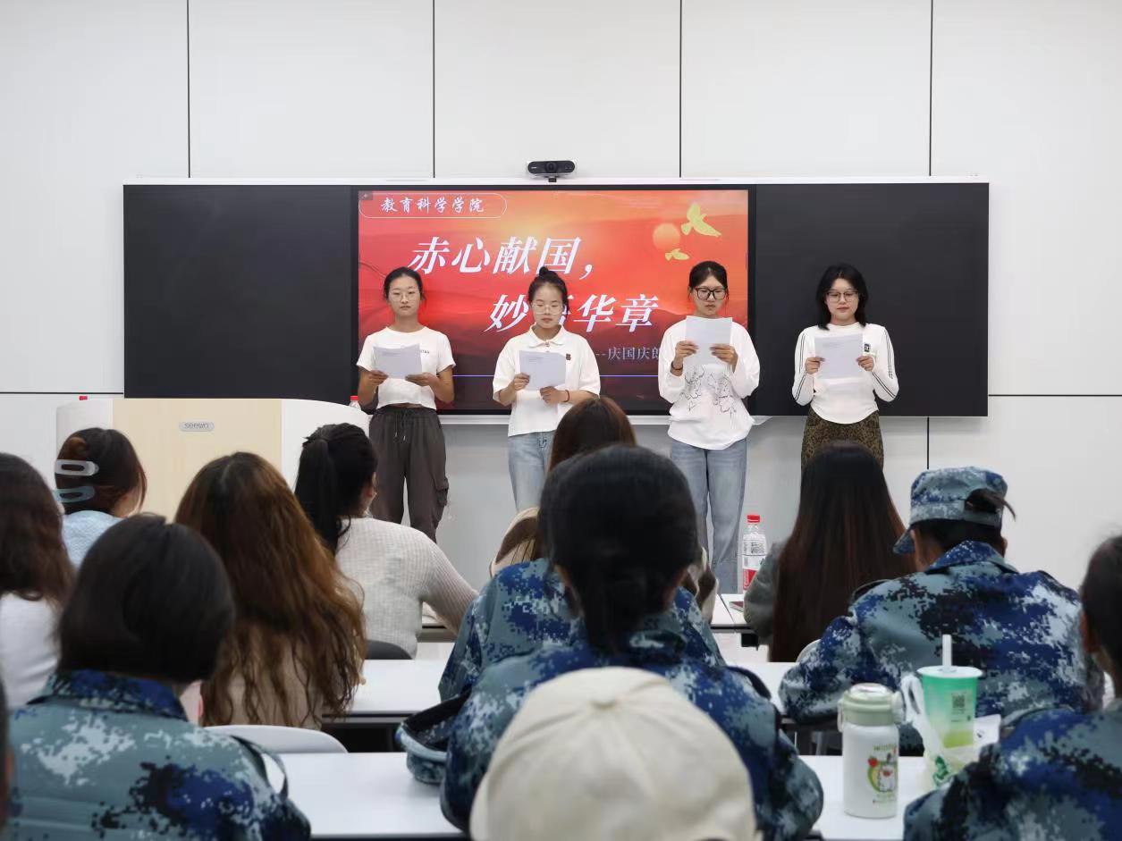 时间:2024-09-29 10:43:34 来源:教科院新闻宣传中心 作者:袁梦悦 阅读: 次为庆祝建国75周年,营造出浓厚的国庆氛围,共同庆祝祖国的生日,表达对祖国的美好祝福,9月28日,教育科学学院于教科微格教室举办“赤心献国,妙语华章”朗诵比赛。教育科学学院团委书记牛洁楠,学生会主席张梦淇、副主席游媛冉、刘瑞杰出席本次活动,社会实践部副部长王梦丹主持此次活动。