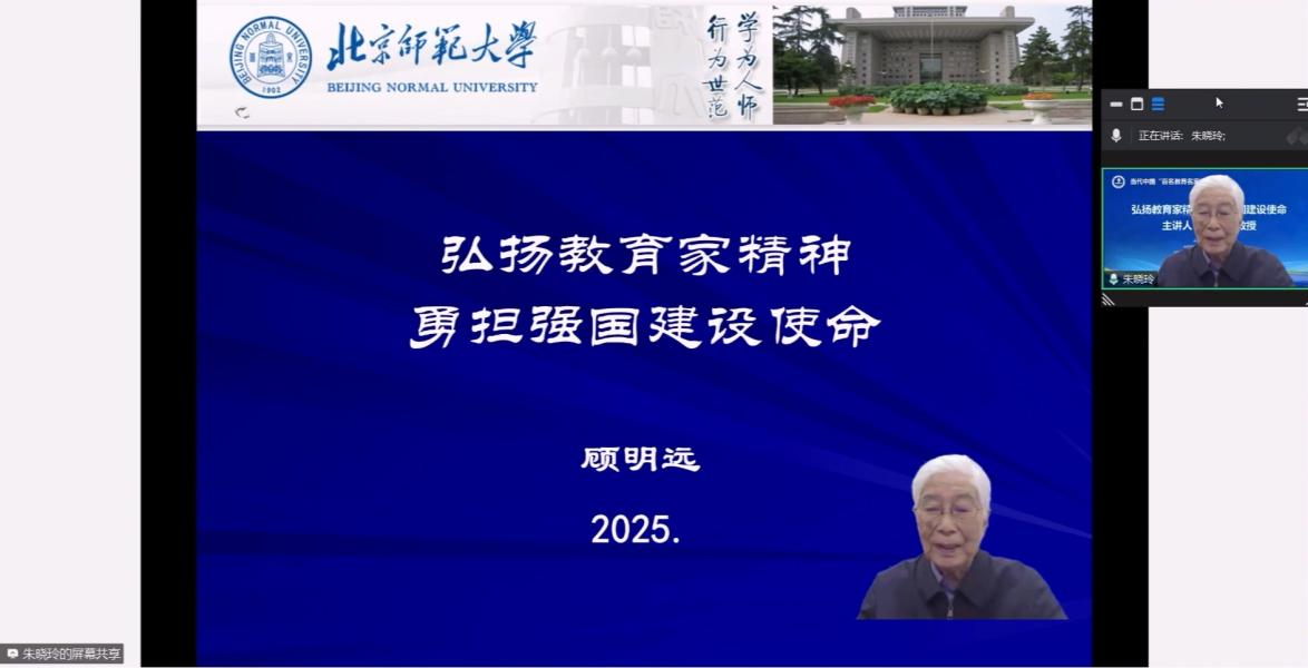 时间:2025-03-05 21:37:24 来源:教科院新闻宣传中心 作者: 阅读: 次3月4日,由信阳师范大学主办、教育科学学院承办的“当代中国‘百名教育名家’大讲堂”第一讲在教育科学学院301会议室开讲,当代著名教育家、中国教育学会名誉会长、北京师范大学资深教授顾明远先生通过线上平台做了题为《弘扬教育家精神 勇担强国建设使命》的专题报告。校党委书记王文鹏,副校长王娟出席报告会,教育科学学院领导班子及100余名师生代表参加报告会。报告会由王文鹏主持。