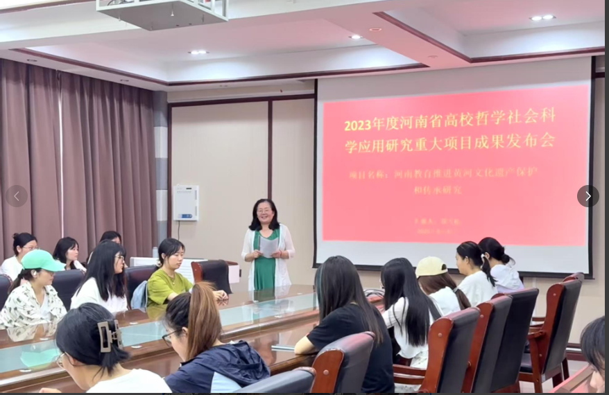 时间:2025-06-05 19:59:04 来源: 作者: 阅读: 次2025年6月4日下午,民族文化传承与教育团队郑雪松主持的2023年度河南省高校哲学社会科学应用研究重大课题成果发布会在教育科学学院会议室402成功举办。发布会以“河南教育推进黄河文化遗产保护和传承研究”为主题,重点发布了该主题的重大研究成果。在民族文化与教育团队的张莉娜、骆丽娟、冯靖雯等老师以不同方式带领参会的研究生和本科生熟悉本课题基本内容的基础上,郑雪松宣读了本课题的重大研究成果。