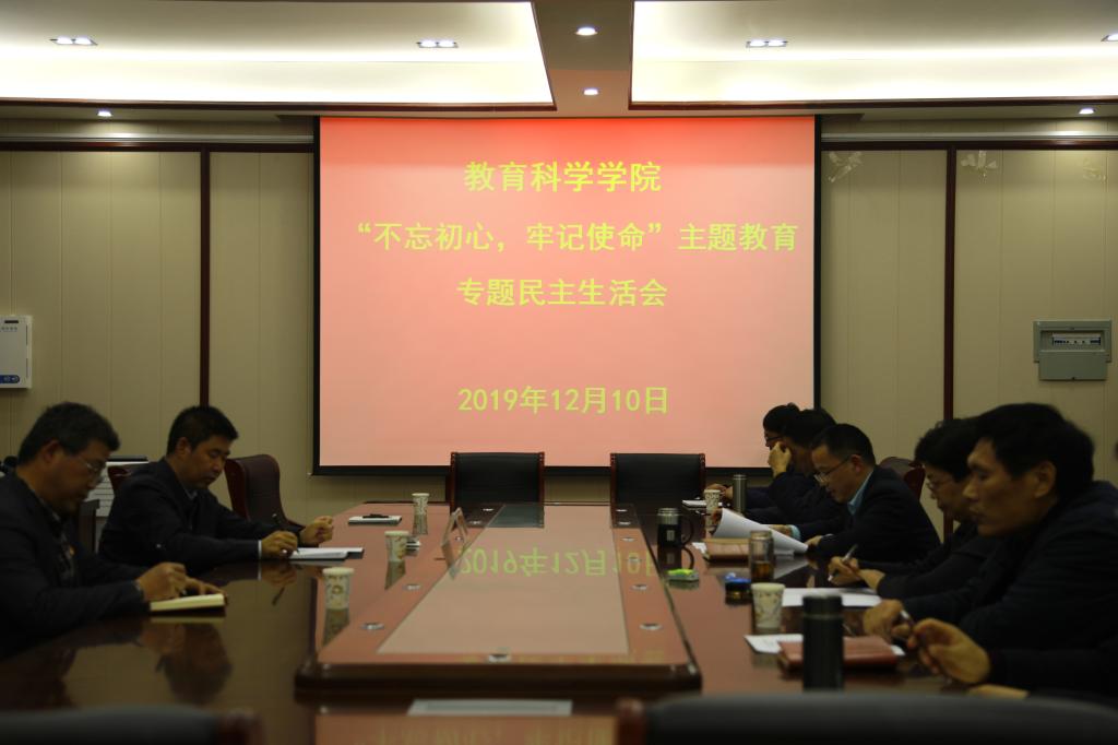 12月10教育科学学院“不忘初心、牢记使命”主题教育专题民主生活会在教科楼402会议室召开。校党委书记宋争辉到会指导,校主题教育第巡回指导组成员姜兴周出席会议,教育科学学院全体处级干部参加会议。会议由学院党委书记李辉主持