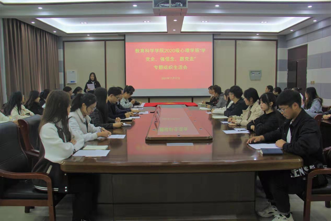 11月11日至17日,教育科学学院各团支部陆续召开“学党史、强信念、跟党走"专题组织生活会。17日邀请校团委副书记张鹏、校团委组织部老师余艳楷指导2020级心理学班团支部组织生活会,学院党委书记房加帅,团委老师朱方、田园以及2020级心理学班团支部第一小组成员参与本次会议,会议由该班团支书王琳主持。