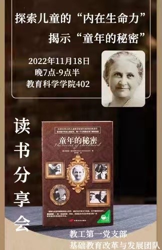11月18日,由教育科学学院教工第一党支部基础教育改革与发展团队发起的第二期读书报告会在教科楼402会议室成功举办。本次读书会的主题为:探索儿童的“内在生命力”,揭示“童年的秘密”。阅读书目为:《童年的秘密》。读书会由袁怡曼主持,三十余位师生参加。