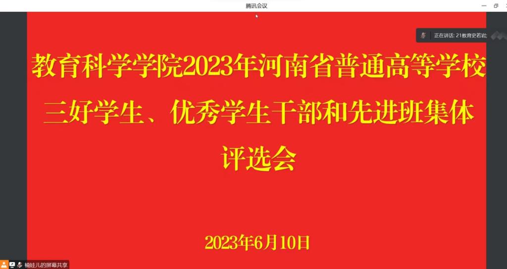 6月10日,教育科学学院于线上召开2023年河南省普通高等学校三好学生、优秀学生干部和先进班集体评选会。院党委副书记董银银,分团委书记牛洁楠,专职辅导员田园、杨艺卓、提尼格尔出席此次会议。会议由牛洁楠主持。